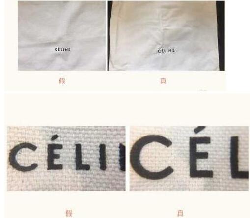 真的防尘袋,celine的字体是小号的,而且字体印刷细腻。正品的logo印字十分清晰舒服,没有溢边的情况;而假货的烫印是浮于袋子表面的,字体轮廓会有明显的溢边,比如E头上的一撇。