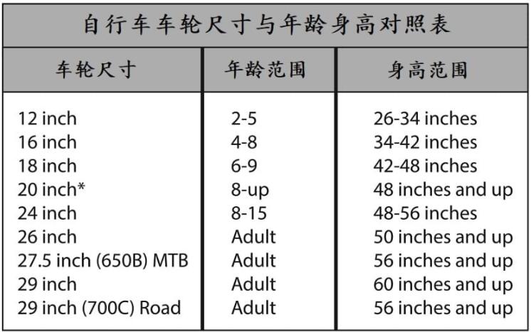 2、自行车车轮尺寸与年龄身高对照表