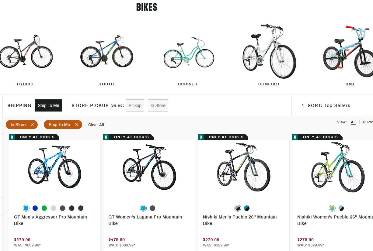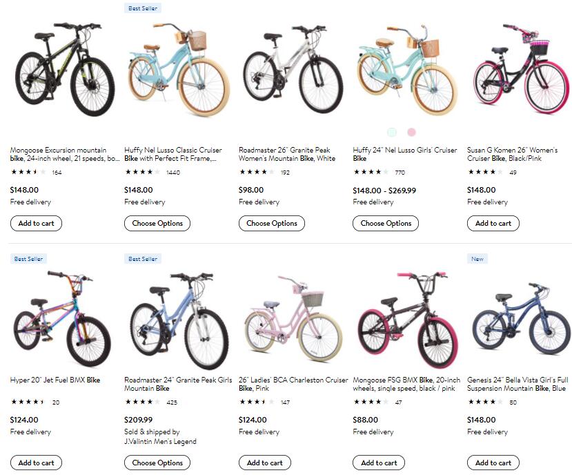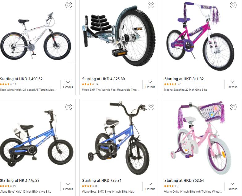 舒适型自行车的价格从$275-$690,山地车的价格$275-$1,325,公路车价格$52 -$2,725。