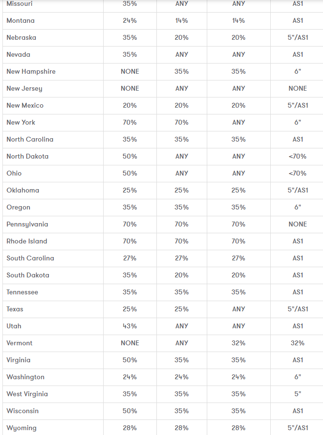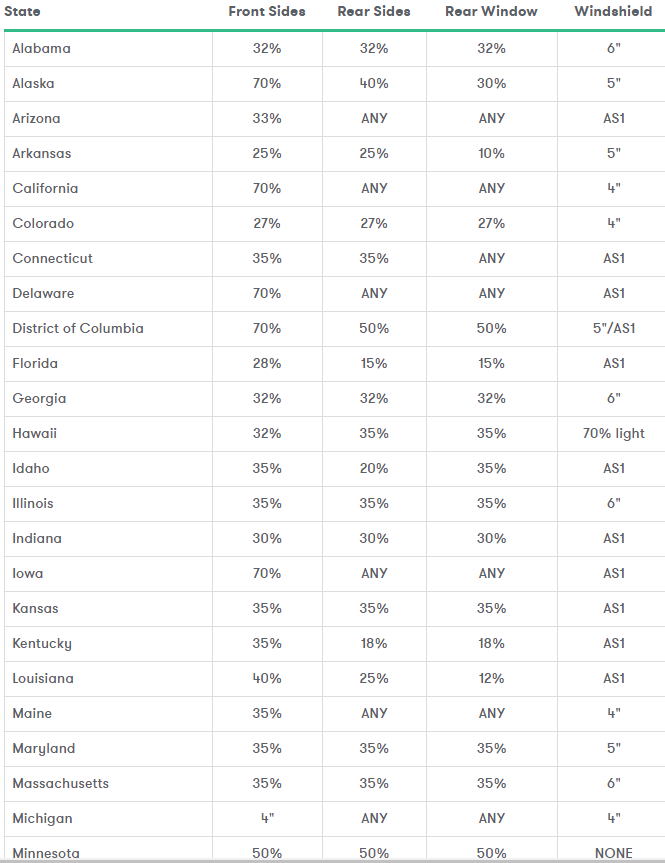 美国各州对车窗贴膜透光率要求如下(仅供参考)