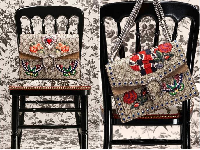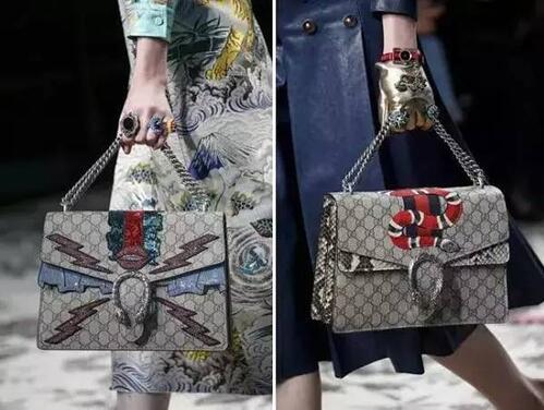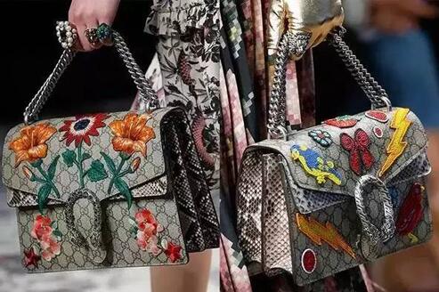 Dionysus酒神也是一个伟大的农业神,植物神。在Gucci 做过13年配饰设计师的Alessandro Michele 更是懂得把握细节之美,将这种美发挥到了极致。设计师在传统的GG Supreme印花上,注入了时髦独特的刺绣细节,将各种动物、植物的图案手工刺绣于包包上,栩栩如生的呈现出来,似乎有种"起死回生"的即视感,如同酒神的起死回生之力。 Gucci推出的酒神款也许是想表达重生信念,又或许能是想表达对天然本物向往的理念。这也寓意了品牌因此起死回生了。