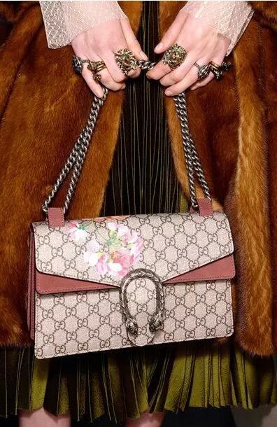 Dionysus系列中多数款式采用了GG Supreme缇花织布,这个图腾是古驰双G图案的衍生花纹。系列中有各个款式的手袋,在GG Supreme缇花织布面料上佐以花卉图案,更增添了不少浪漫与艺术气质。