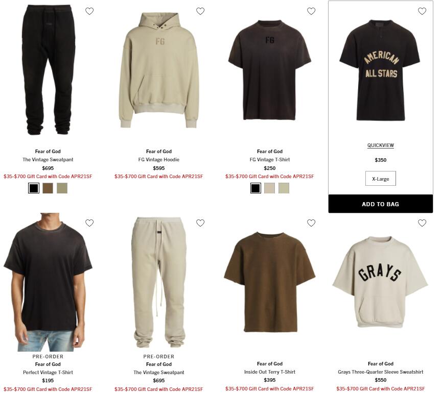 【网站简介】Saks Fifth Avenue是世界顶级的高档百货公司之一,在全球有超过50家的门店,旗舰店位于纽约第五大道,大牌男女装、国际名牌包包、女鞋,化妆品,首饰等一应俱全。 Saks Fifth Avenue涵盖了各种一线品牌,可以说你想要的这里都能淘到,并且 Fifth Avenue提供直邮中国的服务哦,非常的方便。目前购买Fear of God可获得$35- $700礼品卡,使用优惠码:APR21SF。