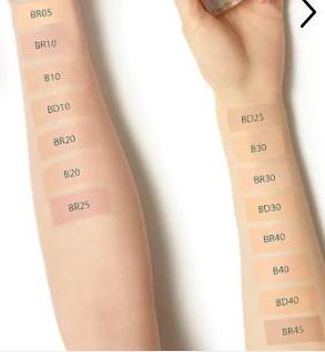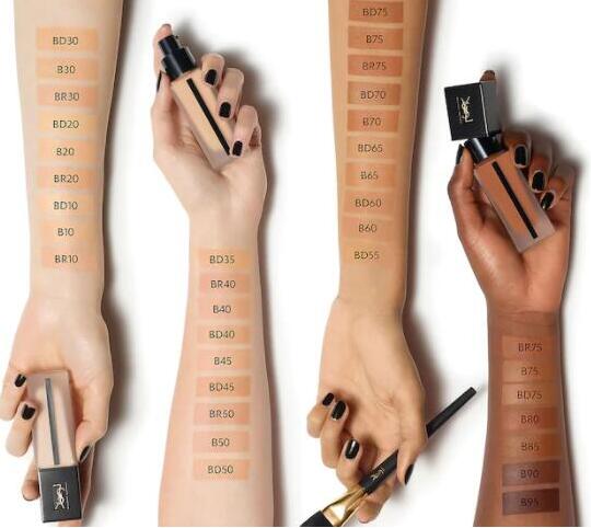 YSL超模粉底液它在亚洲只上架了8个色号,它们分为三个色调:B是黄调自然色系,是亚洲人首选的色调、BR是粉调、BD是自然金色调;最浅的色阶是10,然后是20、30,以此类推。