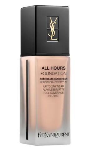 YSL All Hours系列新款YSL恒久粉底液是高遮瑕、高控油、高持妆的一款粉底。哑光的妆效,使肤色无瑕,可保持长达24小时。主打24小时控油防水,不暗沉,微光奶油肌妆感让妆容美丽自然。高覆盖率粉底霜的创新配方具有防水性和抗转移性,不会影响舒适度,也无需修饰。无油配方能全天保持哑光效果,有助于减少毛孔的出现。内含天然珍珠岩活性成分,可有效吸附油汗。富含护肤复合物和紫外线过滤剂,使皮肤看起来清新光滑。 质地细腻,延展性好,轻薄不油腻,水润服帖度好, 遮瑕力中上,持久力非常好。非常适合瑕疵偏油皮,干皮想用的话可在夏天用它,或者把它混进其他粉底里提高遮瑕度和持久度。因为它的高遮瑕,色号选不好容易假面,需要慎重些。