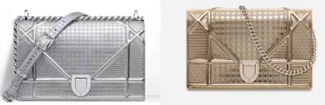 Lady Dior(戴妃包): 这款诞生于20世纪90年代初的手袋,是Dior家族最最经典的包款。因为黛安娜王妃的宠爱,Lady Dior在1996年正式被命名为戴妃包,听上去便知它是高贵和优雅的象征。戴妃包的经典元素除了包身的藤格纹缝线,还有淡金色的Dior字母挂饰、优雅的双手柄设计。迪奥的戴妃包价格从一万到十几万的都有,因为它的材质是从小羊皮到珍贵的鳄鱼皮,所以价格也会相差比较大,大家如果找代购的话一定要擦亮眼睛哦~!