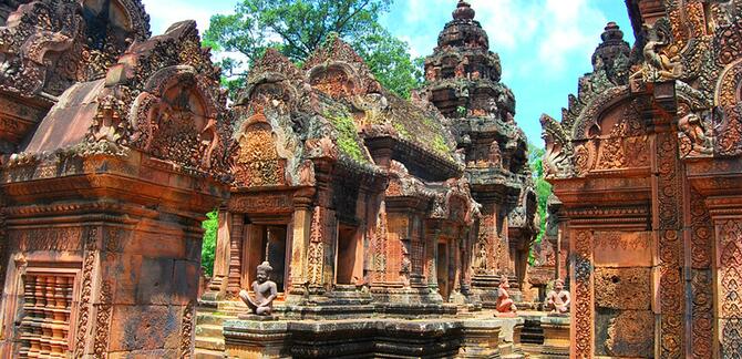 女王宫:意为“女人的城堡”,以艳丽的色彩和精美的浮雕著称于世,是吴哥古迹中风格最独特、最精致的建筑之一。这座印度教寺庙供奉着婆罗门教三大天神之一的湿婆,使用红色砂岩作为建筑材料,被誉为“吴哥艺术宝石”、“吴哥古迹明珠”和“吴哥艺术之钻”。