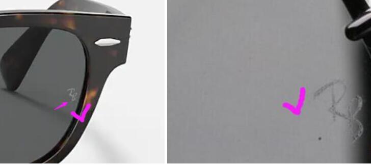 1)在正品的左眼镜片上,靠近和镜腿结合的地方有雕刻的“RB”字样。真假“RB”字样也是不同的,正宗的雷朋眼镜,商标是刻在镜片上的,而不是简单贴上去的。