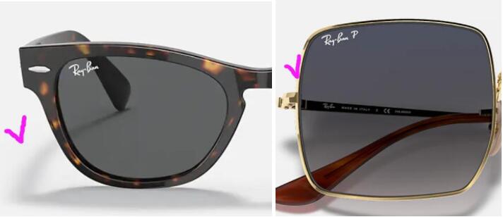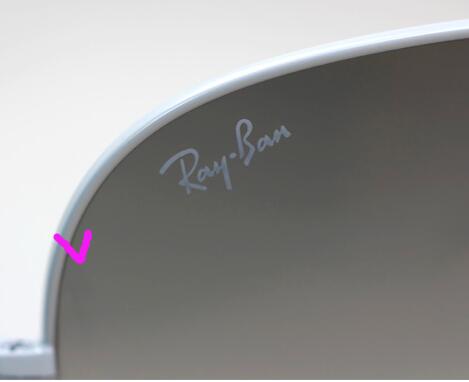 1)正品雷朋太阳镜右眼镜片上有白色Ray.Ban标志,为丝印工艺印制上去,偏光款为Ray·Ban P标志。字样清晰,非常耐磨,据说使用佩戴十年以上的镜片上的白色Ray.Ban丝印标志依然清淅美观。