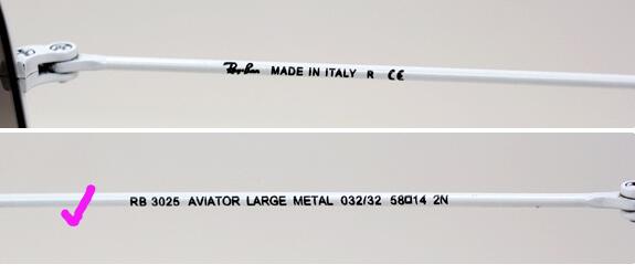2)右镜脚上主要会有雷朋LOGO、MADE IN ITALY、欧盟CE标志等字样;左镜脚上印有型号,色号,尺码,是用特殊墨水印的,不是刻印的,用手摸得出来浮印的字体。