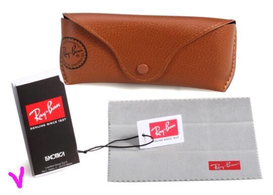 2)通常新买的眼镜盒上会贴有一张透明贴,上有“100%防紫外线 — 雷朋 — 陆逊梯卡公司制造的太阳镜”(100% UV Protection - Ray ban - Sunglasses By Luxottica)的字样。