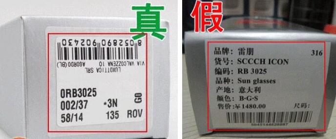2)文字内容都是专业条码打印出来的,出库码和条形码不仅俱全而且印制的还非常的清晰。假货标签信息混乱,大多打出了汉字,还把品牌打成“雷朋”,“雷朋”是Ray-Ban的音译名,是中国人翻译过来的并非官方认可的品牌。