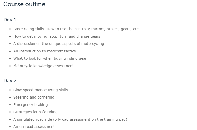 预约好培训班后,他们会给你安排一个7小时的基础课程,通常是分两天完成,在这个课程中,主要是平衡、换档、绕圈、启动、刹车等最基本的技术。要去学习的建议仔细看一下 Victorian rider handbook , 点击链接可以直接下载。