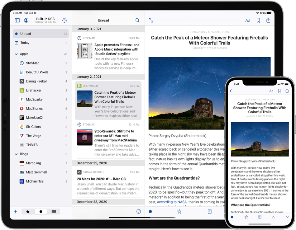 苹果端老牌 RSS 阅读器,iOS 和 Mac 最佳,“没有之一”,可惜的是在国区APP Store下架了。这款软件真的是集颜值与功能为一体的超级好用的阅读器。