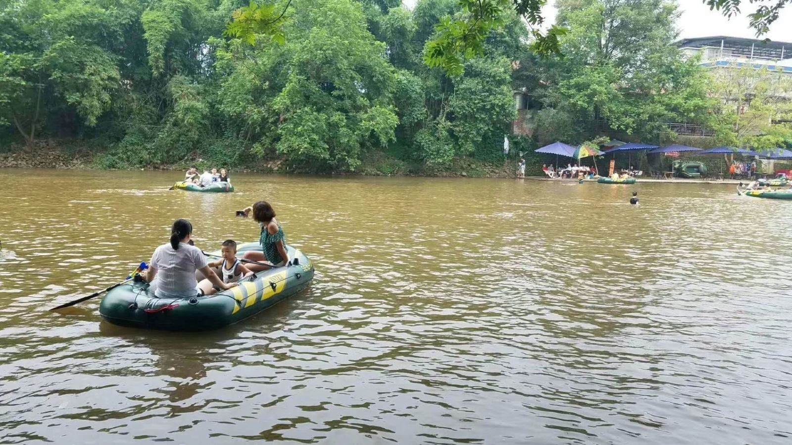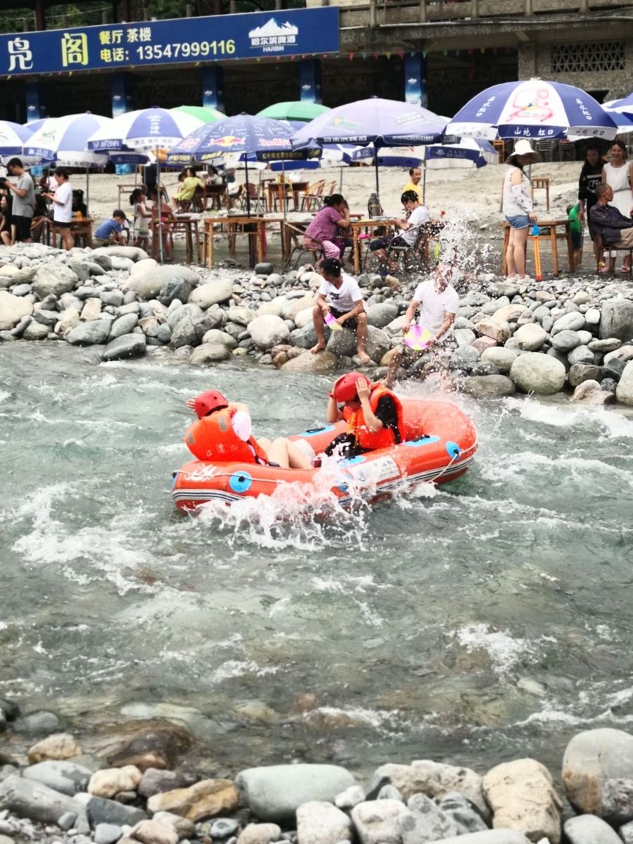 在河两边有很多农家乐,坐在树荫下喝茶打麻将都非常的巴适!这儿耍法很多,什么划竹筏啊,橡皮艇啊,不亦乐乎!