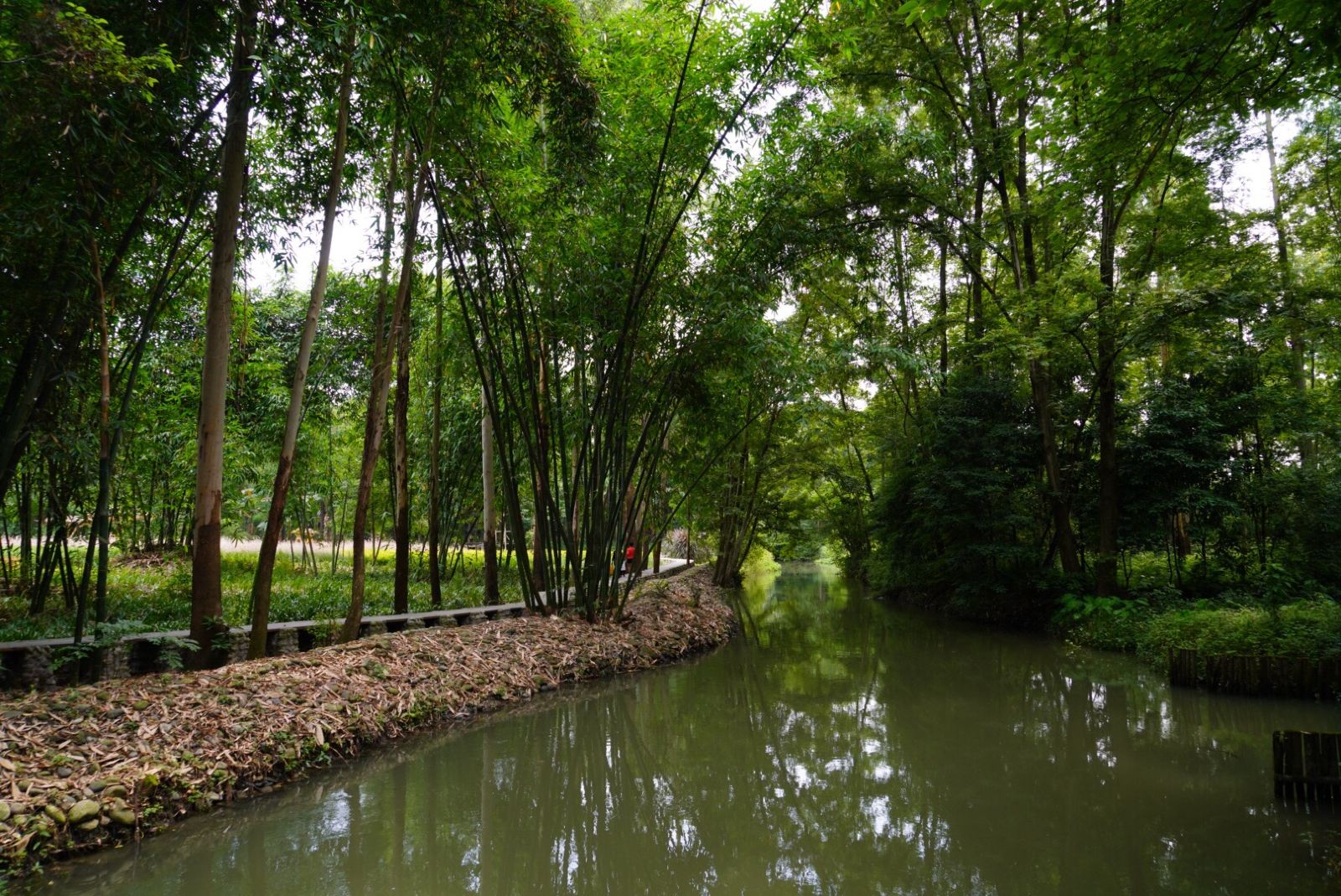 新津斑竹林距成都市区25多公里,除了很少一部分人工打造的餐饮茗茶休闲区外,完全是一个原始竹林和河流,江安河、羊马河环绕其中。