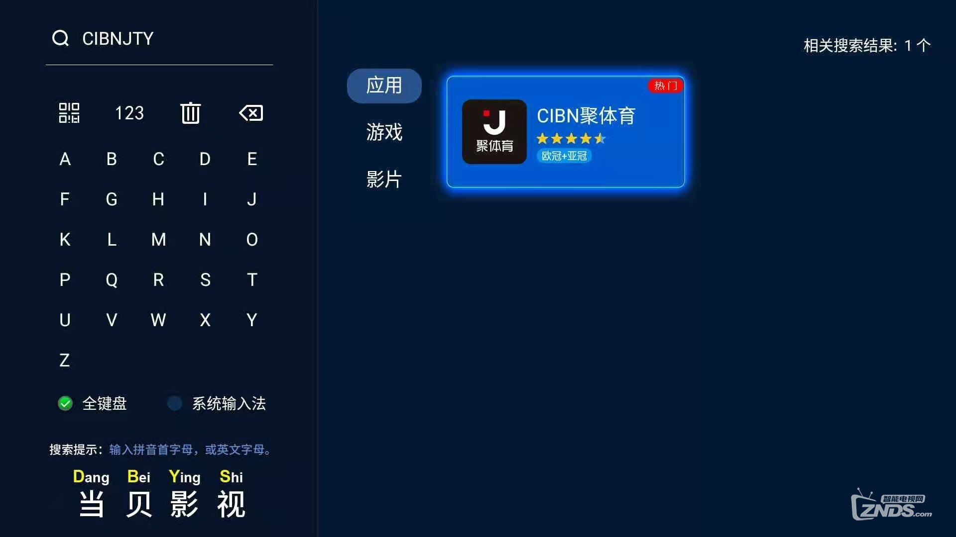 打开当贝市场搜索爱奇艺TV版拼音首字母“AQYTVB”即可下载安装。安装完成之后找到体育版块即可。