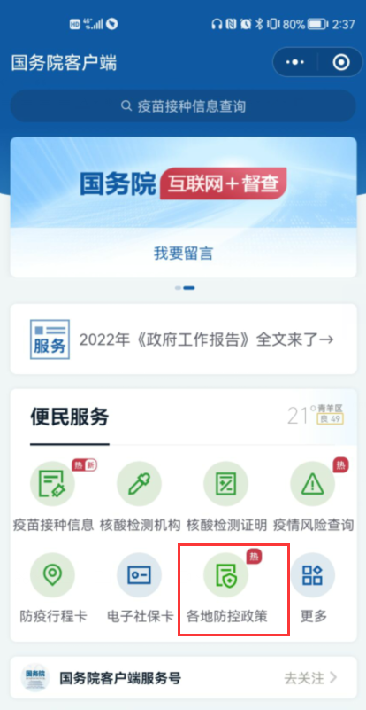 大家可以在微信或者支付宝搜索“国务院客户端”,然后进入该小程序,在国务院客户端首页就能看到【各地防控政策】,接着点击进入就可以查询到国内各地的一个实施入境及防疫政策。