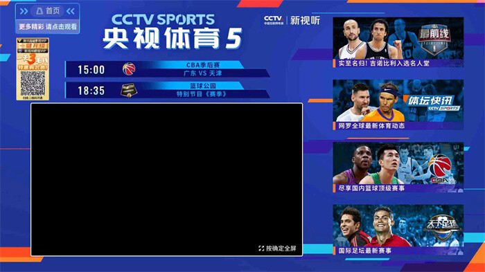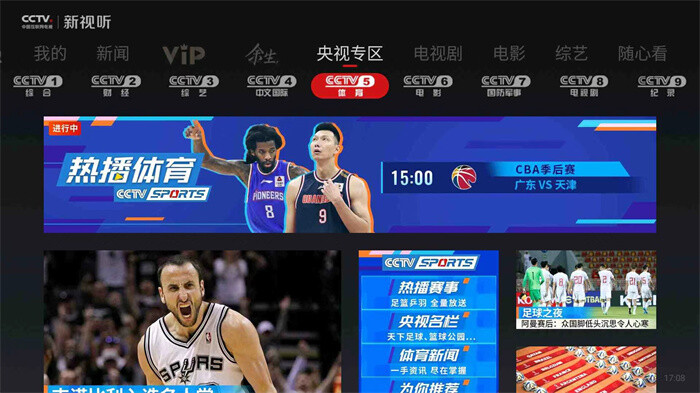 打开软件后在【央视专区】-【CCTV5】中可以看到CBA季后赛的直播入口