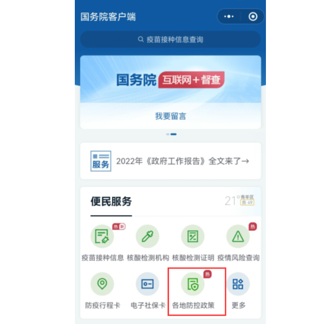大家可以在微信或者支付宝搜索“国务院客户端”,然后进入该小程序,在国务院客户端首页就能看到【各地防控政策】,接着点击进入就可以查询到国内各地的一个实施入境及防疫政策。