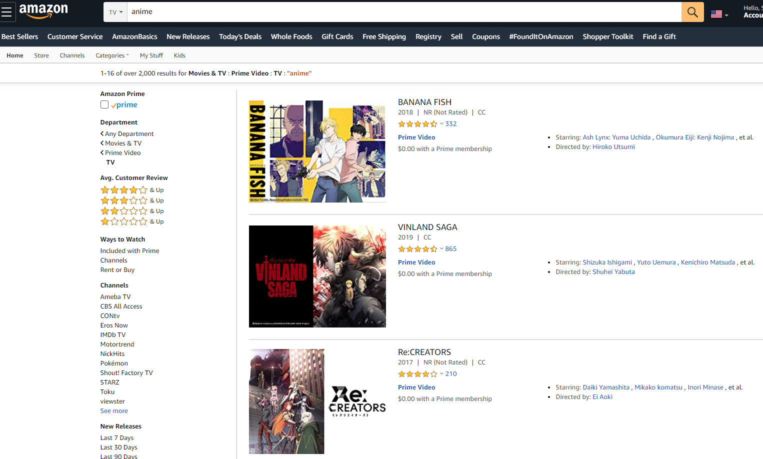 Amazon Prime Video是我们比较熟知的服务,但是亚马逊进入动漫领域比较晚, 一直到2017年的 Anime Strike才开始提供动画流媒体内容专区。Amazon Prime Video 的订阅用户可以通过每月再额外支付 5 美元来观看亚马逊的独家动画内容。