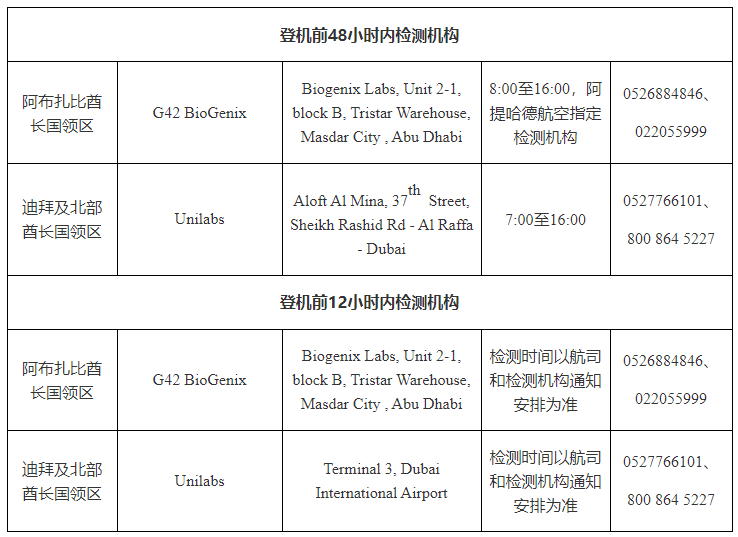 所有自阿联酋搭乘航班赴华人员(包括在阿长期居住人员、中资企业人员、国内临时来阿人员、第三国来阿人员)须进行“双核酸”检测,第一次核酸检测在登机前48小时内进行,第二次核酸检测在登机前24小时内进行,两次核酸检测须在两家不同检测机构、采用不同试剂进行,两次采样间隔24小时以上。