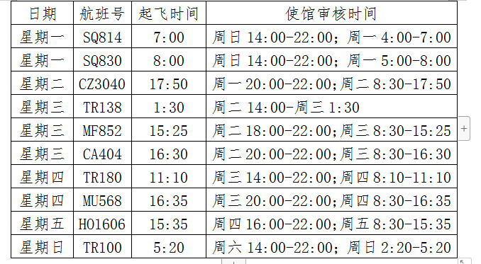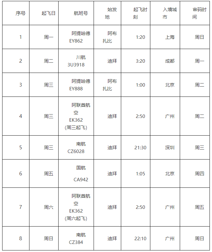 注:上述航班中,国航CA942航班将于9月2日复航,阿联酋航空EK362(周六起飞)于8月20日复航。请赴华人员密切关注民航局与航司官网通知,合理规划行程。