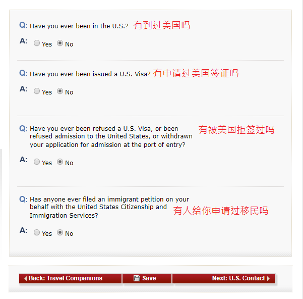没有被拒签过美国签证,这里都填NO就好了。有的话也要如实输入,因为美国移民局都查得到您的纪录。