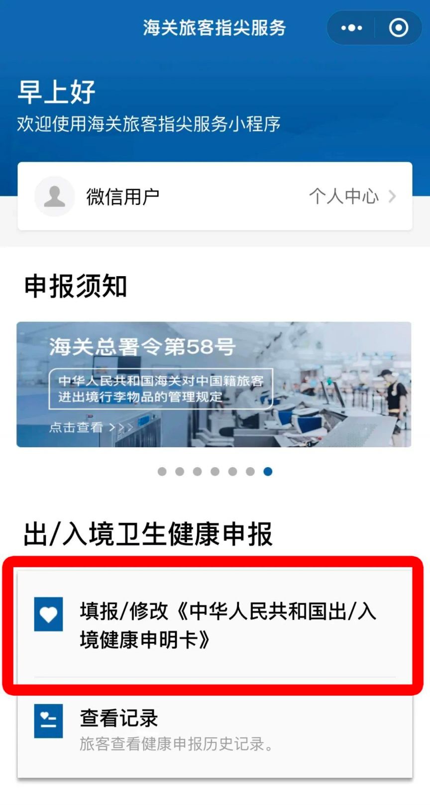 第一步:进入“海关旅客指尖服务”首页,并点击“填报/修改《中华人民共和国出/入境健康申明卡》”进入填报页面。