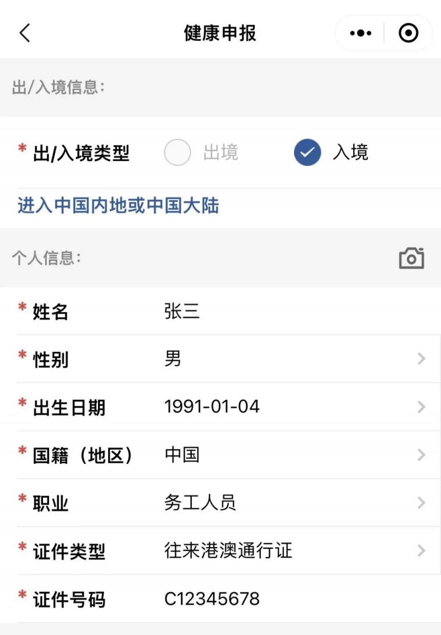 第二步:在“出入境类型”项目根据实际情况勾选“出境”或“入境”,在个人信息栏目如实填报姓名、性别、出生日期、国籍、职业、证件类型、证件号码。注意:正确选择出入境方向:澳门→珠海,选择入境。
