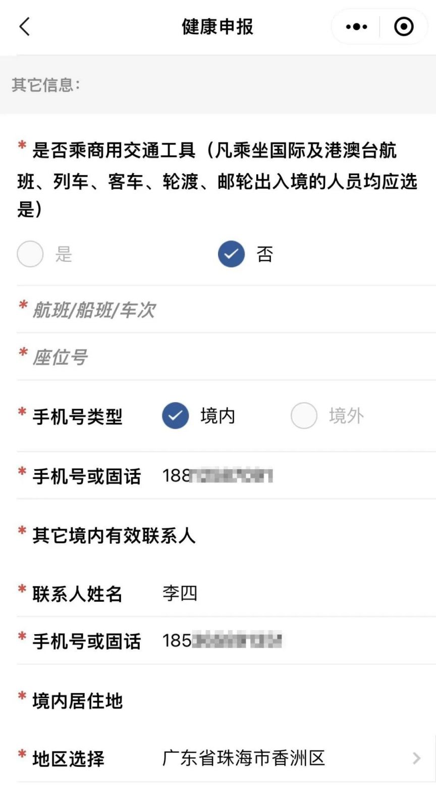 第三步:在“是否乘商用交通工具”项目根据实际情况勾选“是”或“否”,如选“是”,填报“航班/船班/车次”和“座位号”,如选“否”,无需填报;再依次填报手机号类型、号码、其他境内有效联系人姓名、号码;在“境内居住地”项目下拉选择省、市、区。