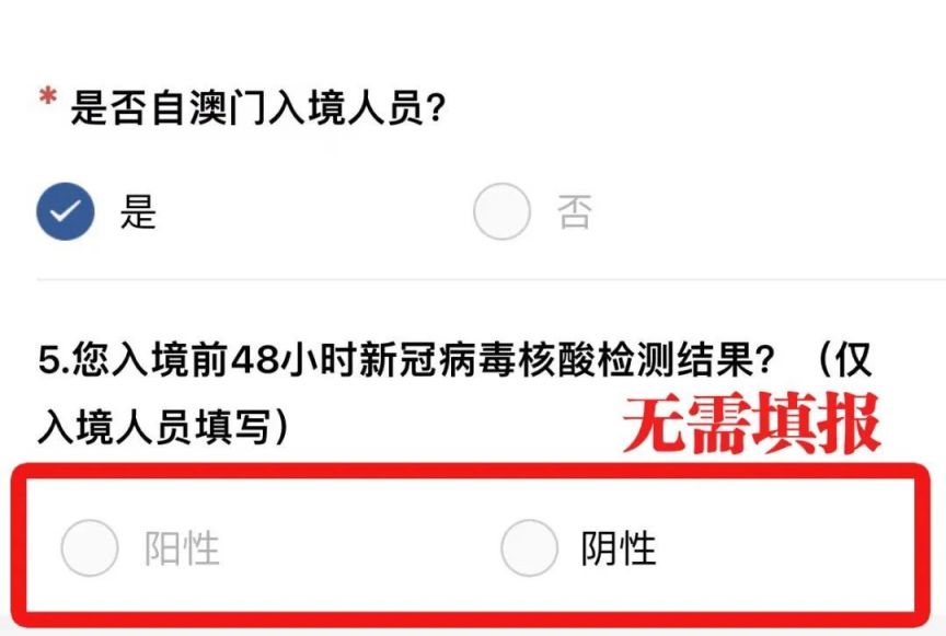 第六步: 在“是否自澳门入境人员?”项勾选“是”。第5项“您入境前48小时新冠病毒核酸检测结果?(仅入境人员填写)”无需填报。