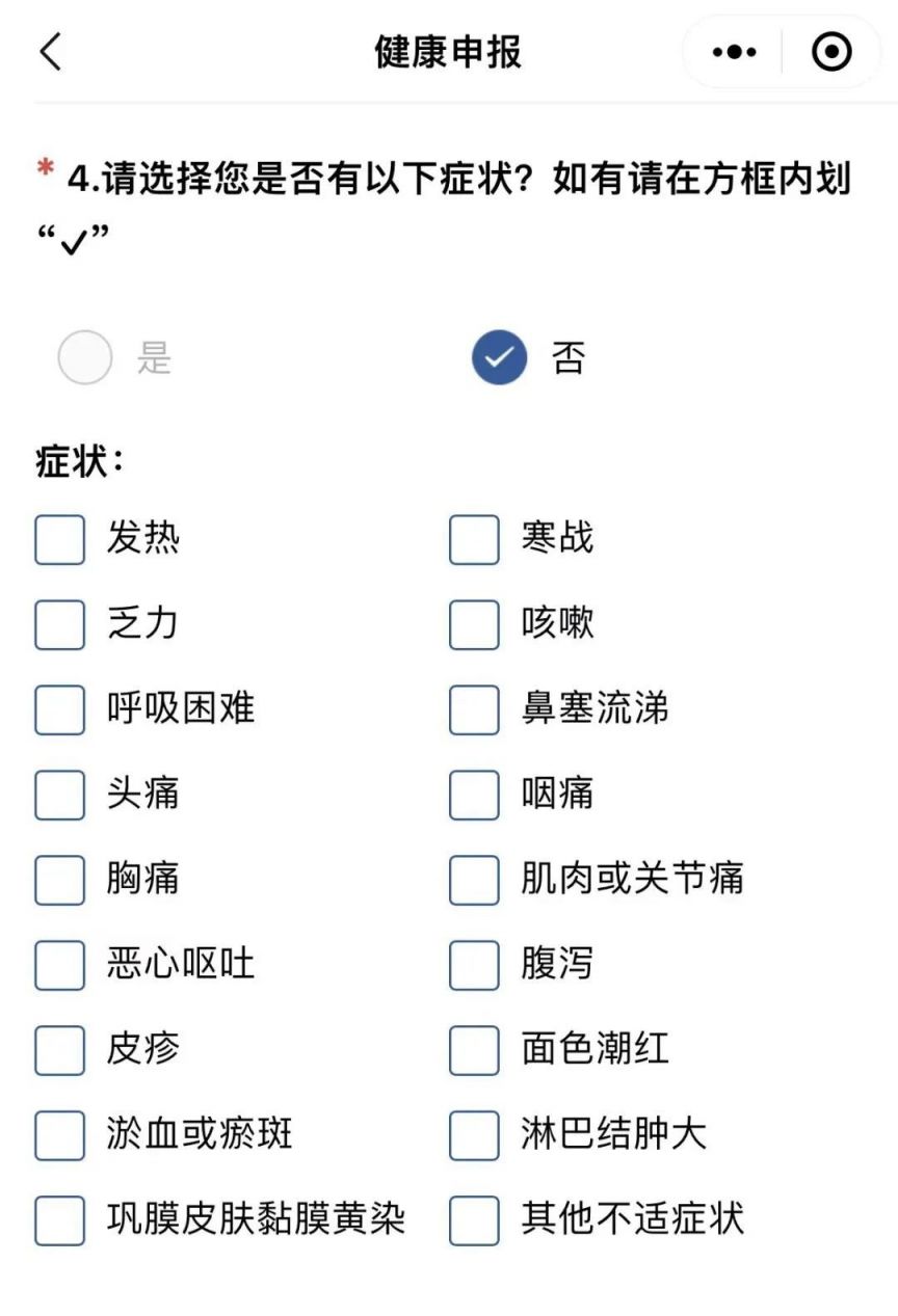第五步:根据自身实际情况如实填报身体症状。如选择“是”,勾选对应症状;如选择“否”,无需勾选。