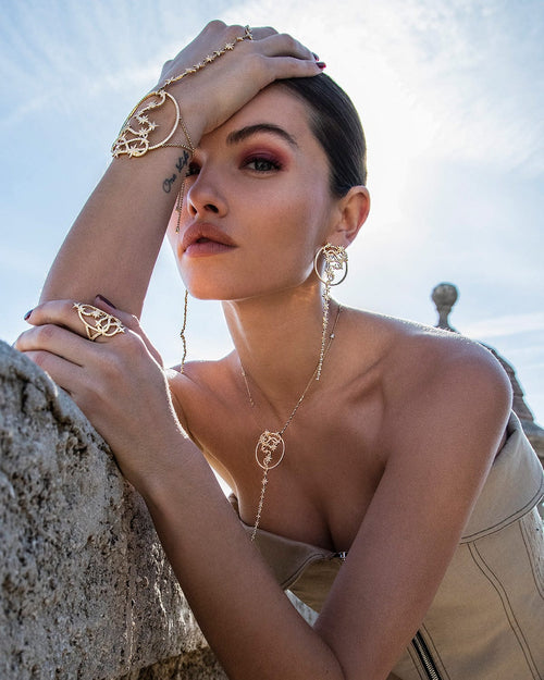 首饰在法国手工制作,以银镀上24K 或钯(palladium)打造,不容易过敏且比纯银首饰更易保养。相比纯银,钯金不但拥有同样的色泽,并且硬度更高,因此也更耐磨。同时,钯金极佳的延展性也使得首饰更加轻盈。品牌有不少耳饰都是比较大且夸张的,所以钯的使用提高了佩戴舒适感。有的也会用珍珠或者施华洛世奇的水晶点缀,戴在身上也是高级感满满。