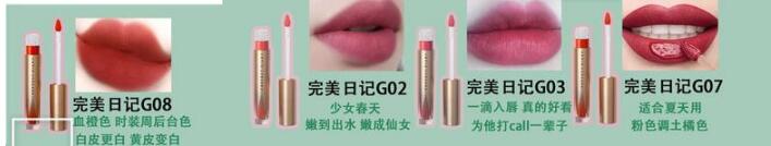 完美日记G08 :血橙色,干了的柿子红, 时装周后台的颜色 ,白皮更白 ,黄皮变白 。