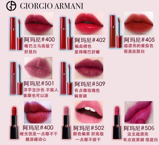 Armani阿玛尼红管400 : 超级热门色,它是带蓝调的雾面红,薄擦直接变元气粉红色,显嫩。