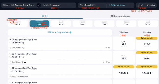 接下来选好你的出发地和目的地戴高乐机场的火车站叫:Paris Aéroport Roissy Charles-de-Gaulle (Gare TGV et Ouigo - CDG 2, à 25 km de Paris) (Île-de-France)