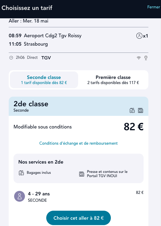 Second二等舱票价是经典的二等座。在一定条件下可以换票和退款。Avantage 卡还会提供这种票价类型的独家优惠。
