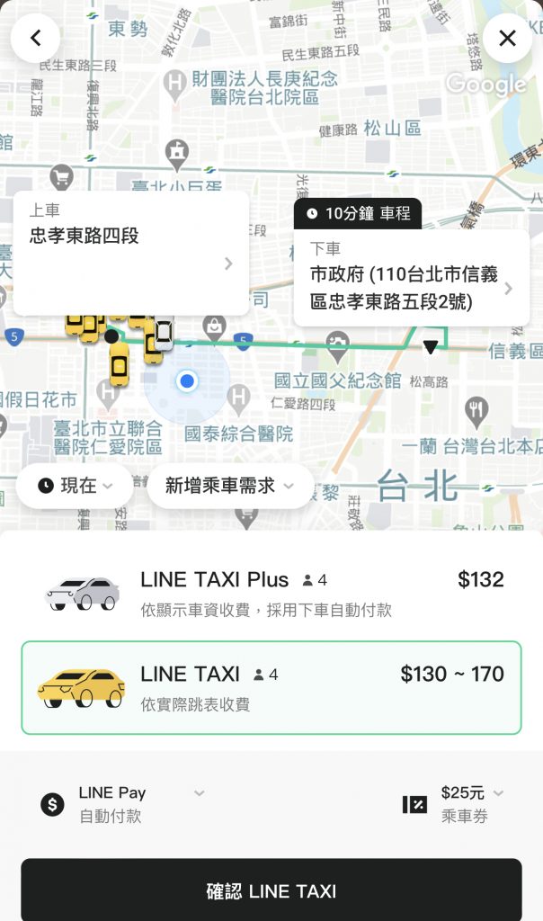 LINE TAXI为跳表计程车,显示为预估车资,实际依照跳表收费。