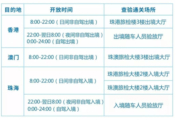 目前港珠澳三地口岸均实行 24 小时通关。其中连接珠海公路口岸及澳门口岸的珠澳大堂于 22:00 至次日 08:00 会临时关闭 ( 适时作出评估及调整 ),而澳门口岸港澳大堂及出入境车道维持 24 小时开放。