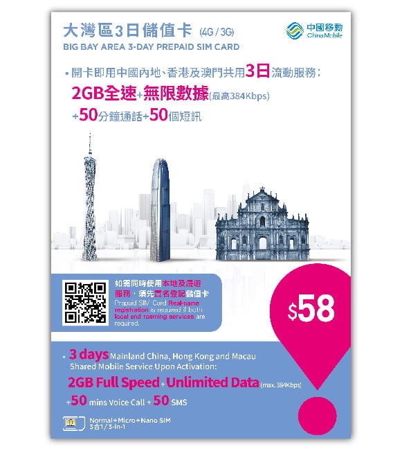 此款中国移动香港4G / 3G大湾区3日储值卡可在便利店购买,为游客提供3天2GB的中国内地、香港和澳门共用数据,价格HK$58,使用后将限速为384kbps。储值卡还提供了50分钟跨境通话和50条跨境短信,方便出差人士。然而,由于此储值卡包含本地数据服务,使用前需完成实名登记,否则仅提供漫游服务。