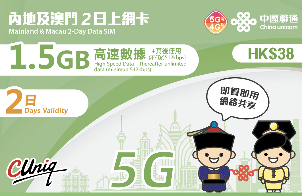 此卡网络覆盖全中国、澳门和香港,让你上网畅通无阻,一卡走天下。使用天数方面可以选择3/5/7/10天的高速4G 500MB/1GB+无限限速数据,价格HK$35起。除此之外,此卡亦提供香港机场领取或本地邮寄,适合马上要出发的你!