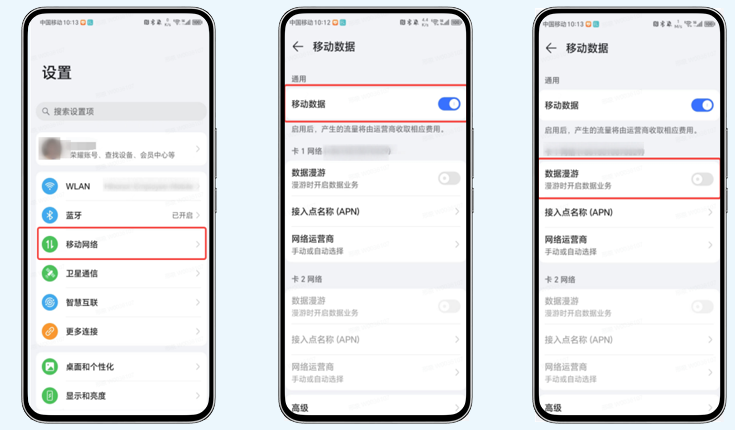 安卓手机:点击“设置”→“移动网络”→“移动数据”,打开“移动数据”开关和“数据漫游”开关。