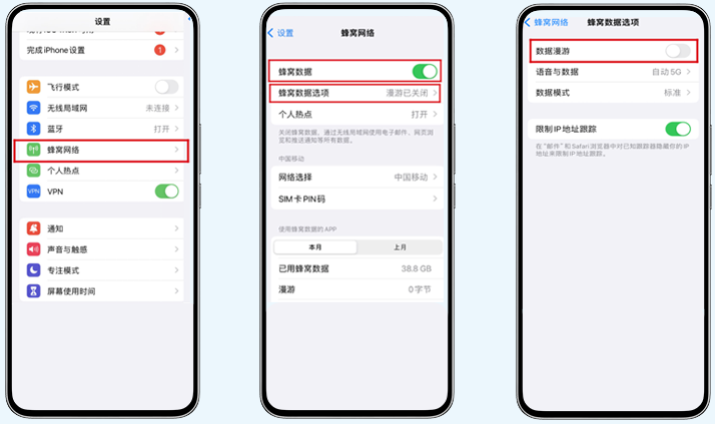 苹果-单卡槽手机:点击“设置”→“蜂窝网络”→打开“蜂窝数据”开关和“蜂窝数据选项”中的“数据漫游”开关。
