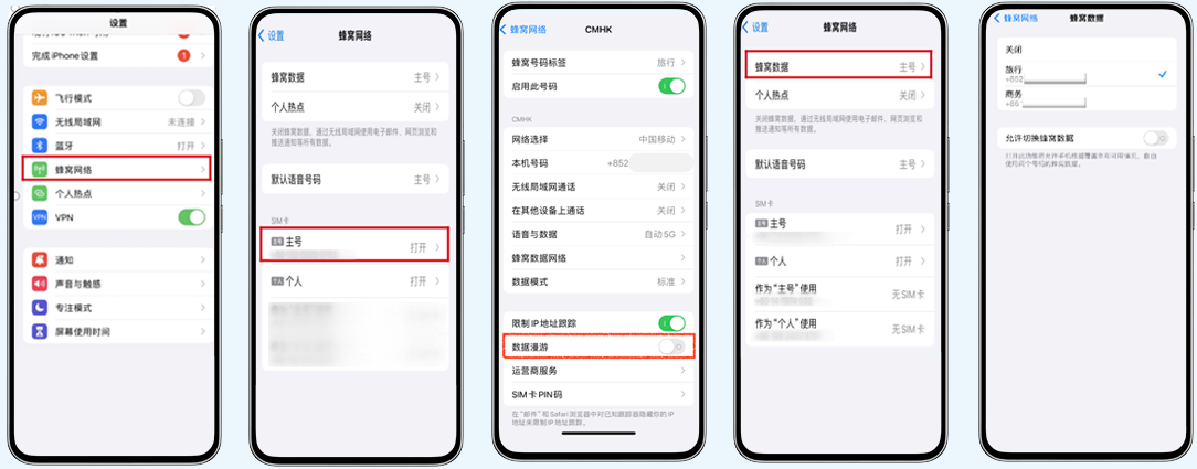 苹果-双卡槽手机:点击“设置”→“蜂窝网络”启用对应SIM卡,打开“数据漫游”开关 → 返回“蜂窝网络”→“蜂窝数据”→选择使用数据的SIM卡。