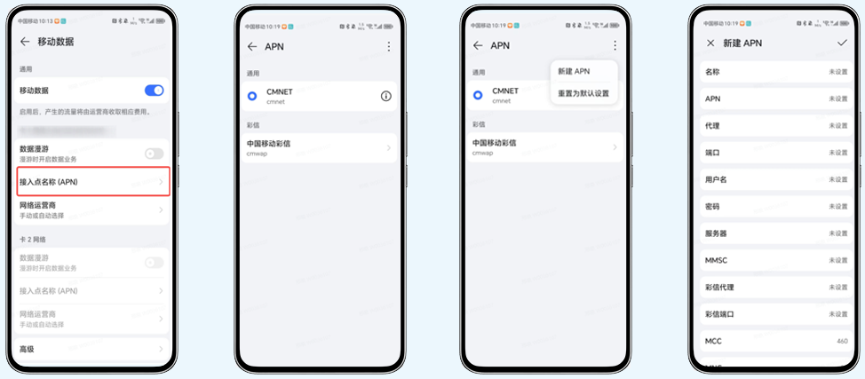 安卓手机:若数据漫游开关打开后仍无法上网,请检查“接入点名称(APN)”设置,手动选择“CMNET”,若无效则手动新建接入点,“接入点名称”和“APN”处填写“CMNET”,其他字段全部默认无需修改。